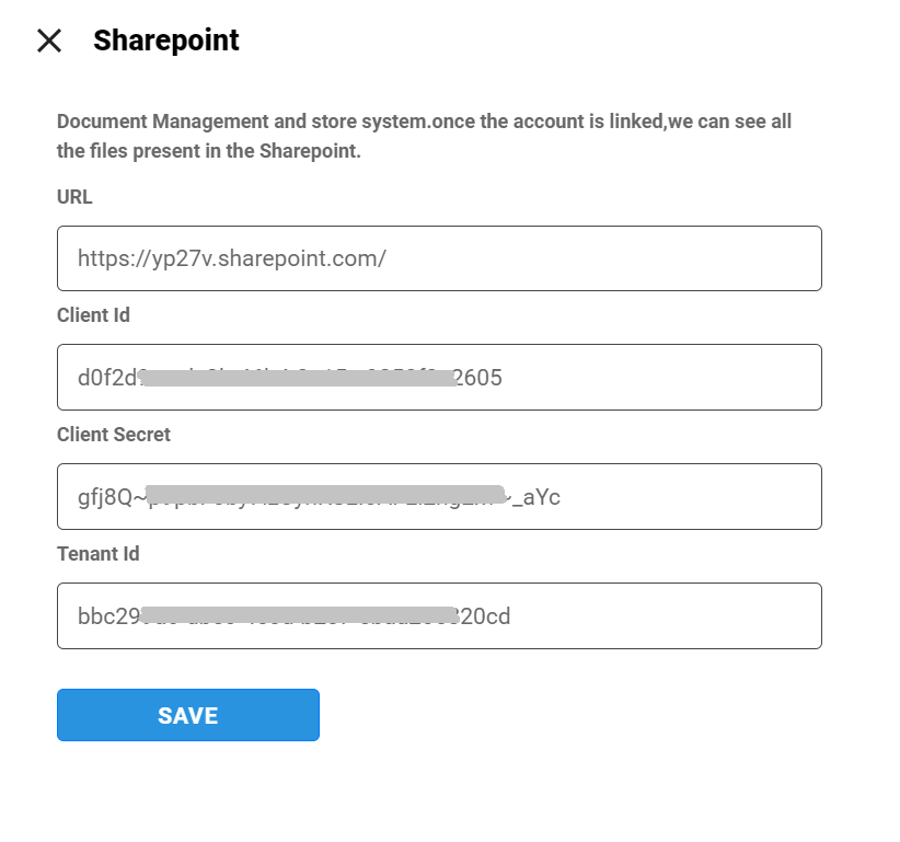 - After updating the details, click SAVE to establish the connection with the SharePoint site.