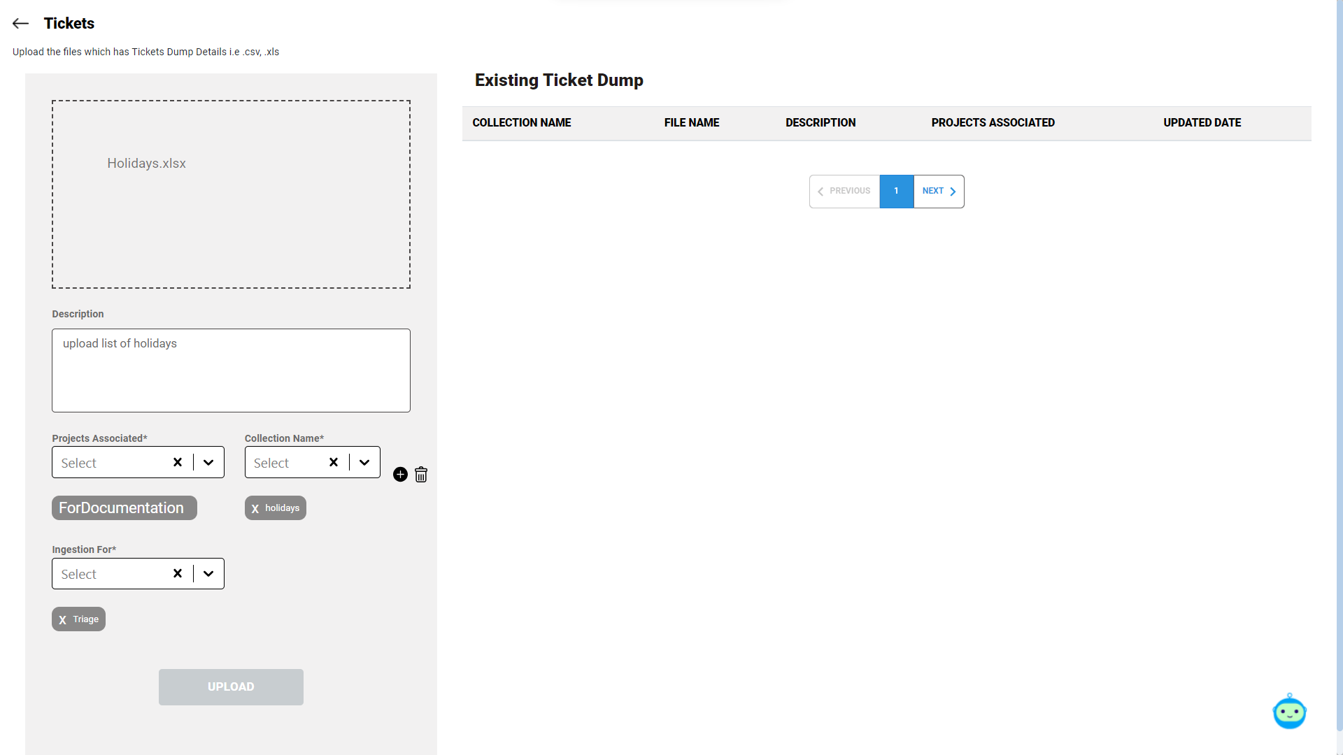 - As a result, the Tickets page will be displayed with options to upload data, project and collection selection.