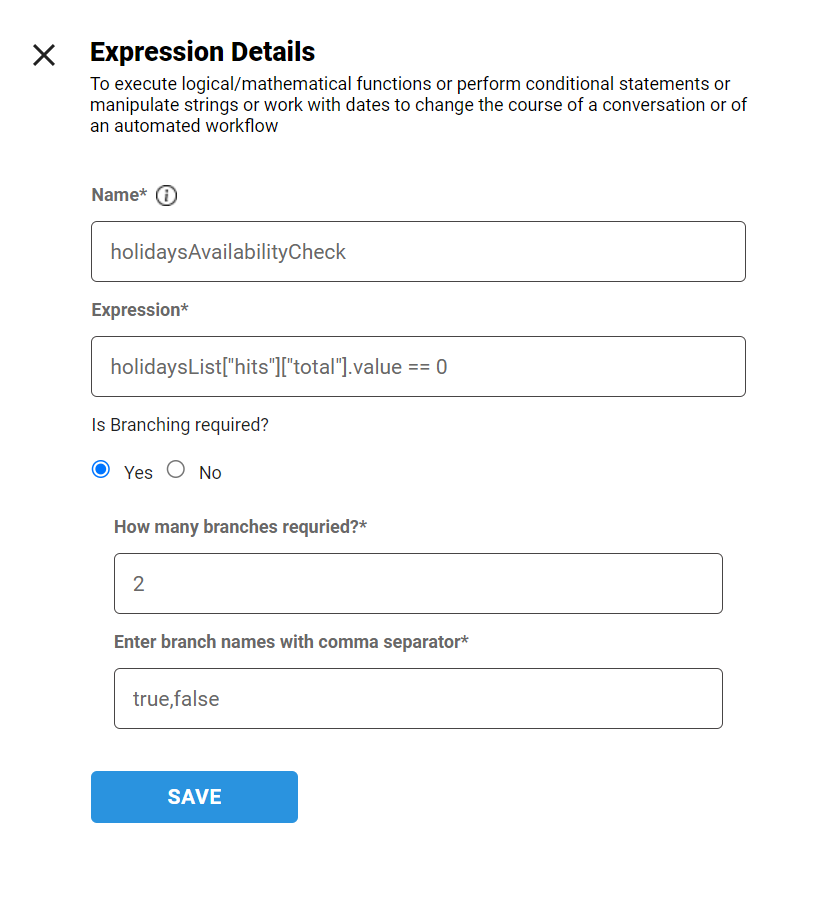 - In the Expression Details form, click SAVE to save the EXPR node details and