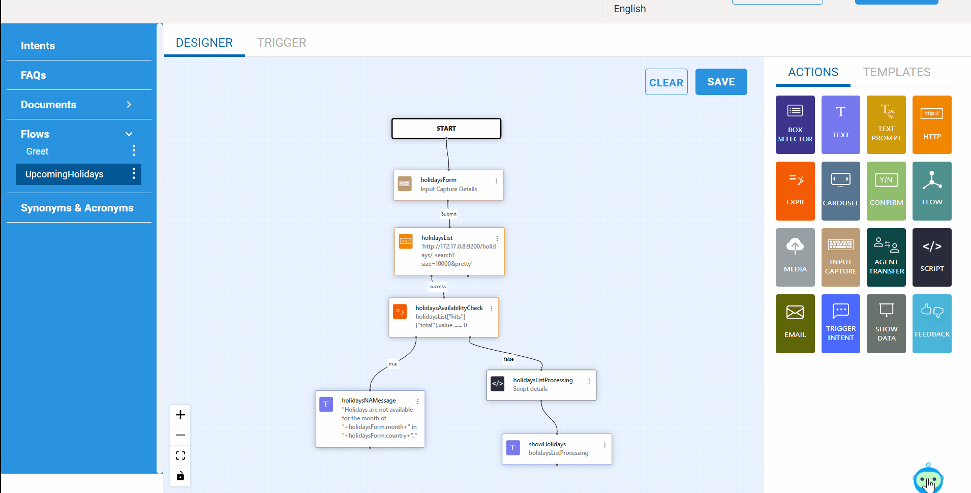 - Click SAVE. You will notice a UpcomingHolidays flow has been created under the Flows page.