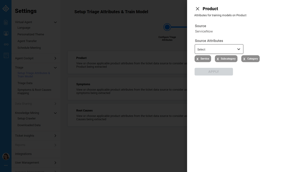 - Navigate to Triage > Setup Triage Attributes and Train Model page under the Settings page, and select corresponding project and source value as "TEST_TICKET - ticketdump".