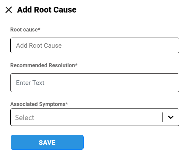Similarly, in the ROOT CAUSES tab, you can add a new root cause, recommended resolution, and associated symptoms.