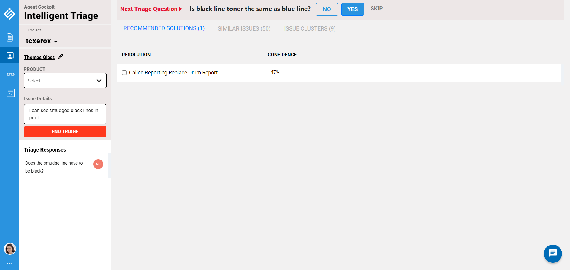 After configuring the data, mapping the attributes and cleaning up the data, navigate to the Product Triage page. By default, the last accessed project will be selected in the Project. If the default project is not expected one, then select the appropriate project and select attributes. In our case, the attributes are just "product", and enter the issue say "I can see smudged black lines in the print". Click Start Triage to generate leading questions and recommended solutions. A sample screenshot with the issue, triage questions and recommended solutions are provided below for reference. The answered triage questions are listed down below the issue text box. Based on the triage questions response, the recommended solution will be narrowed down.