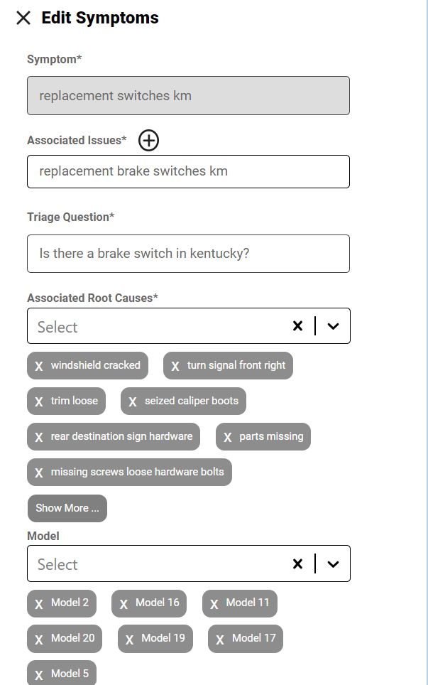 In the Edit Symptoms page, you can modify the existing data like Associated Symptoms, Triage questions, Associated Root Causes and product data. During the triaging process, the associated symptoms are used as utterance of an issue and triage question act as leading questions.