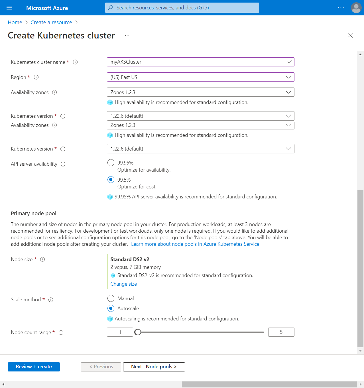 - Select a region for the AKS cluster and set the default value selected for Kubernetes version.