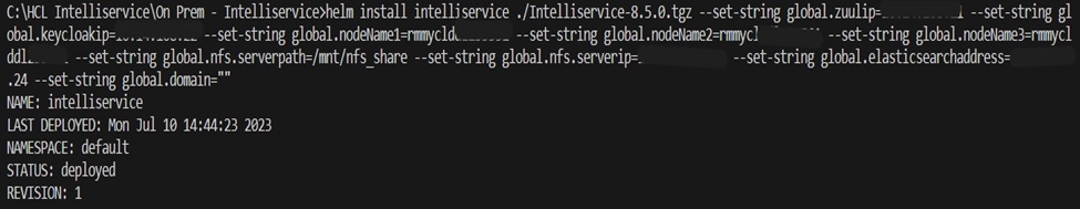The above command deploys IntelliService package 12.1.7 on k8s cluster version-1.24 and above. On successful deployment, you will success message as shown below.