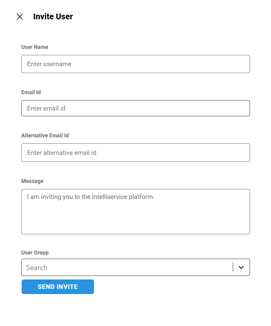 Access the users page from Settings > User Management > Users. In this Users page, add users details like username, email address, alternate email address, and user group to send invitation to user email address with temporary password to access the IntelliService.