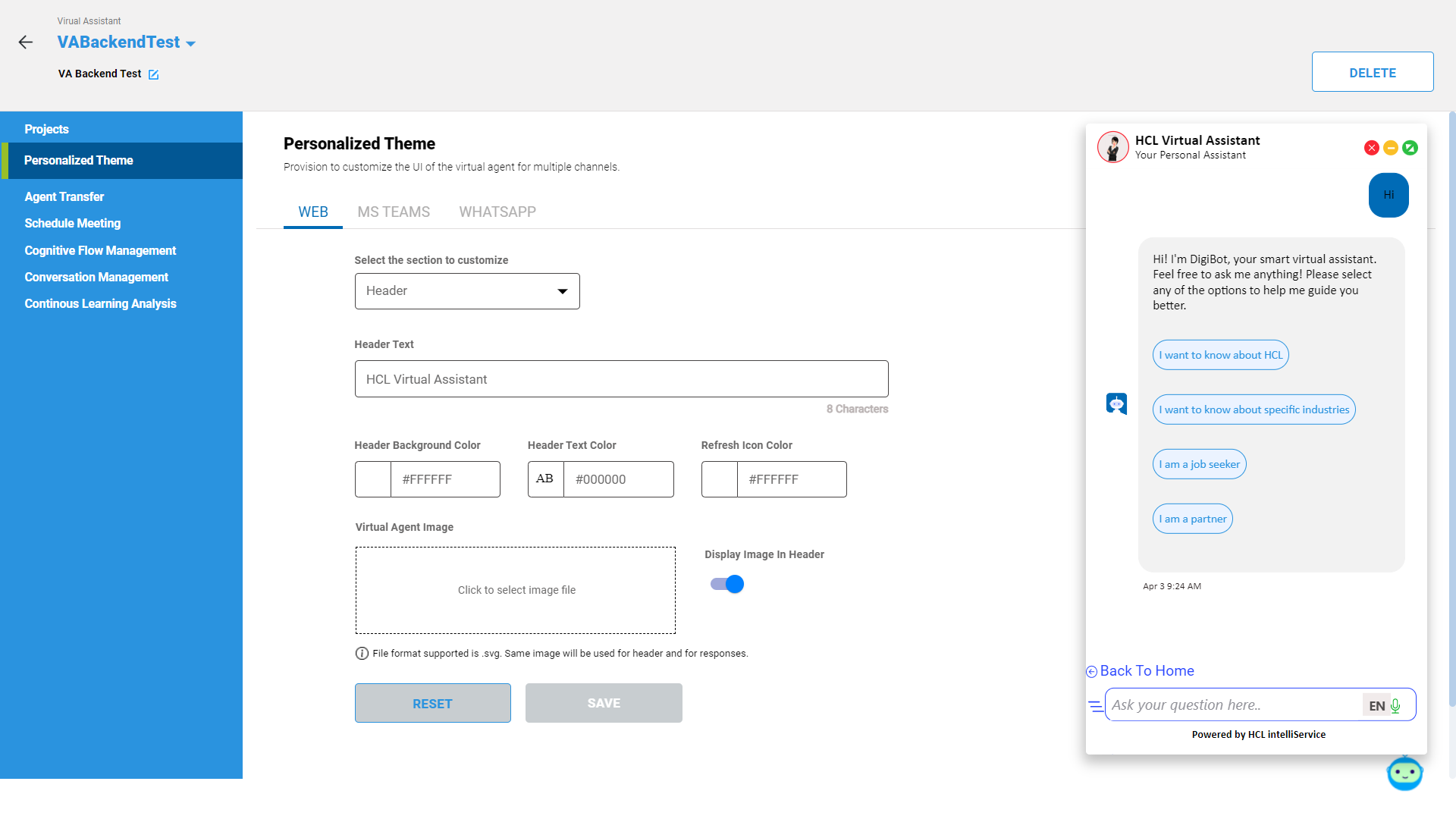 Virtual Assistant (VA) is a virtual agent performing human like conversations and services or tasks based on user conversations. These virtual assistants are group of projects that contain specific set of flows. Each virtual assistants can have customized logo, header, footer and canvas designs. Each of the projects of every virtual assistant can have separate agent transfer, schedule meeting, cognitive flow management and conversation management configurations.