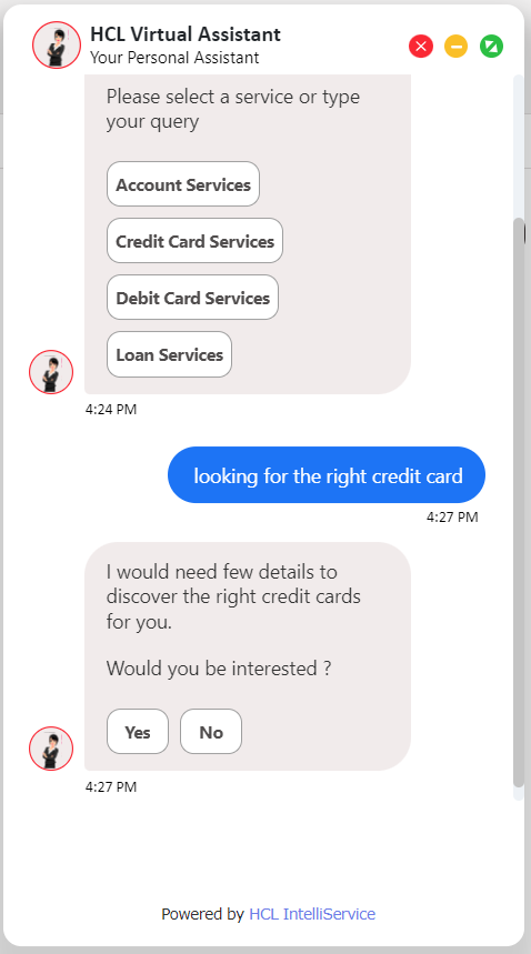 - To start with, on the webpage, click the chat icon and enter your query, say "I am looking for the credit card details".