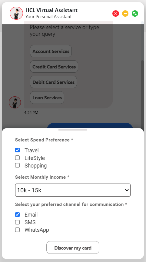 Provide the requested information and click Discover my card. As a result, the flow will analyse the preferences and suggest the credit card accordingly. A sample screenshot is shown below.