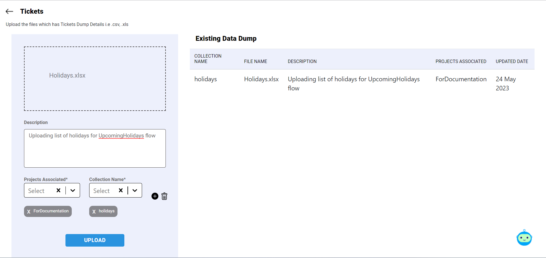 - As a result, the Tickets page will be displayed with options to upload data, project and collection selection.