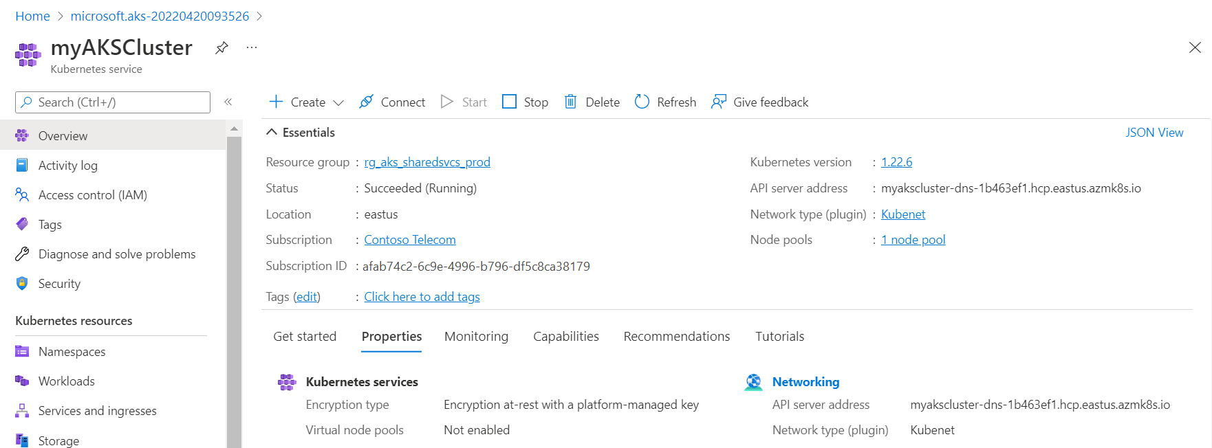- When your deployment is completed, navigate to your resource by either clicking Go to resource, or browsing to the AKS cluster resource group and selecting the AKS resource.
