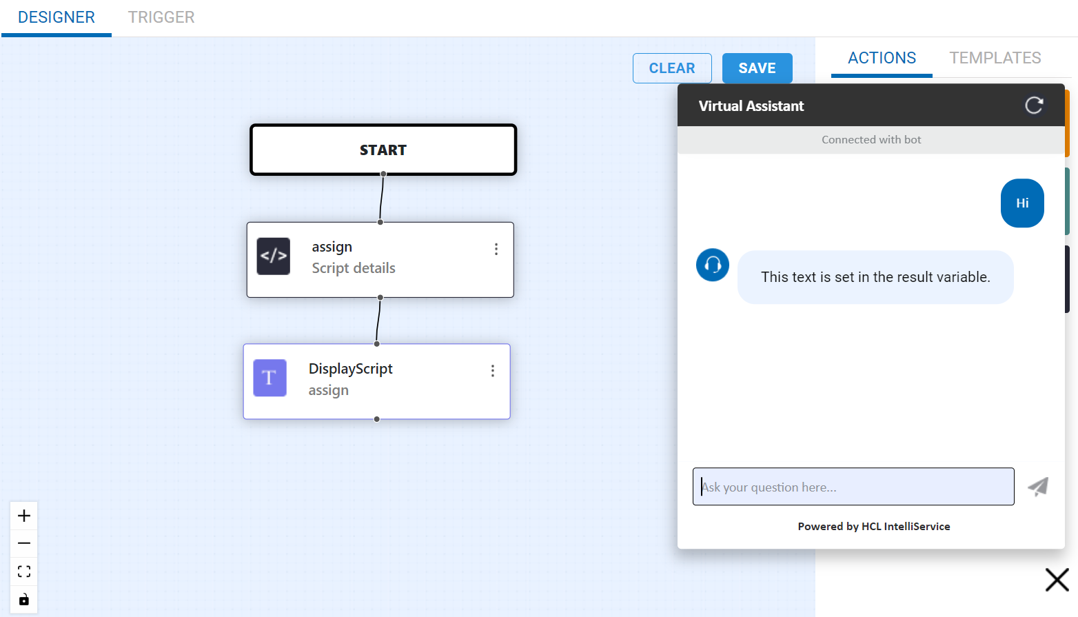 A sample flow demonstrating the Script node, and response in the conversations. In the example below, the assign node is defined with a variable called result and that is set with the text "This text is set in the result variable". The response of the assign node is called in Text node "DisplayScript" to display the result of the script node.