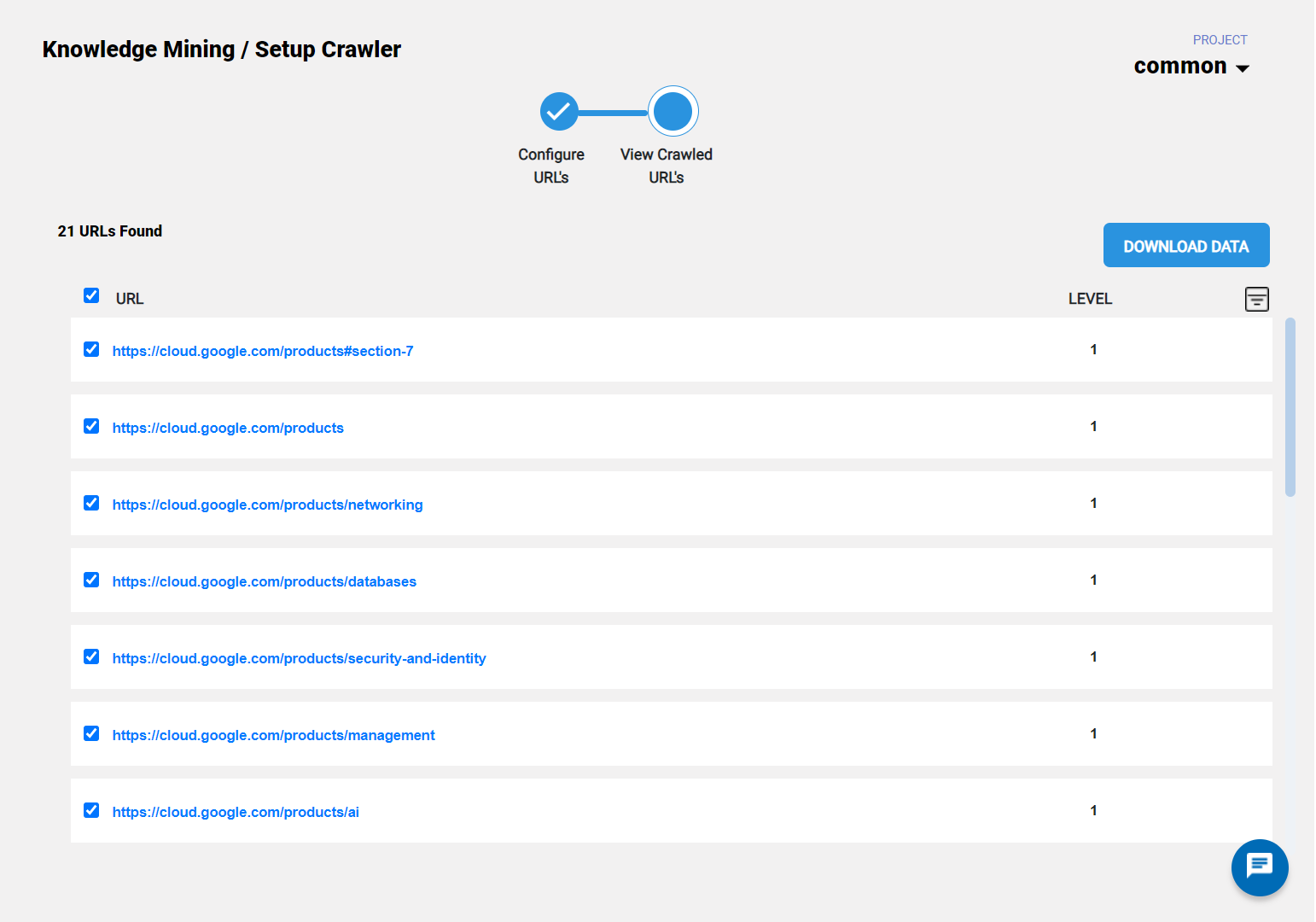Web crawler downloads the content of website and performs the context search on the downloaded content. In the Setup Crawler page under Settings, add the base URL and keywords either to exclude or include the content from mining the website. Also, you have the option to download the embedded documents available in the website. The embedded documents can be PDF, excel, word and text files. Click Start Crawling to crawl all available urls available in the base url. From the list of crawled URLs, you can either select all the urls or specific urls and click Download Data. In the Downloaded Data page, the downloaded urls will be listed along with the status.