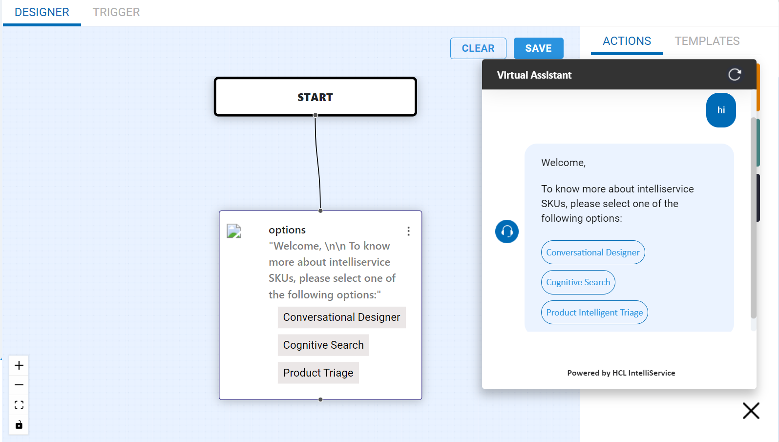 A sample flow to demonstrate the box selector node and user response in the conversation. In the below example, each option is included with an url. When user clicks one of the option, the conversation will open the corresponding url in next pages.