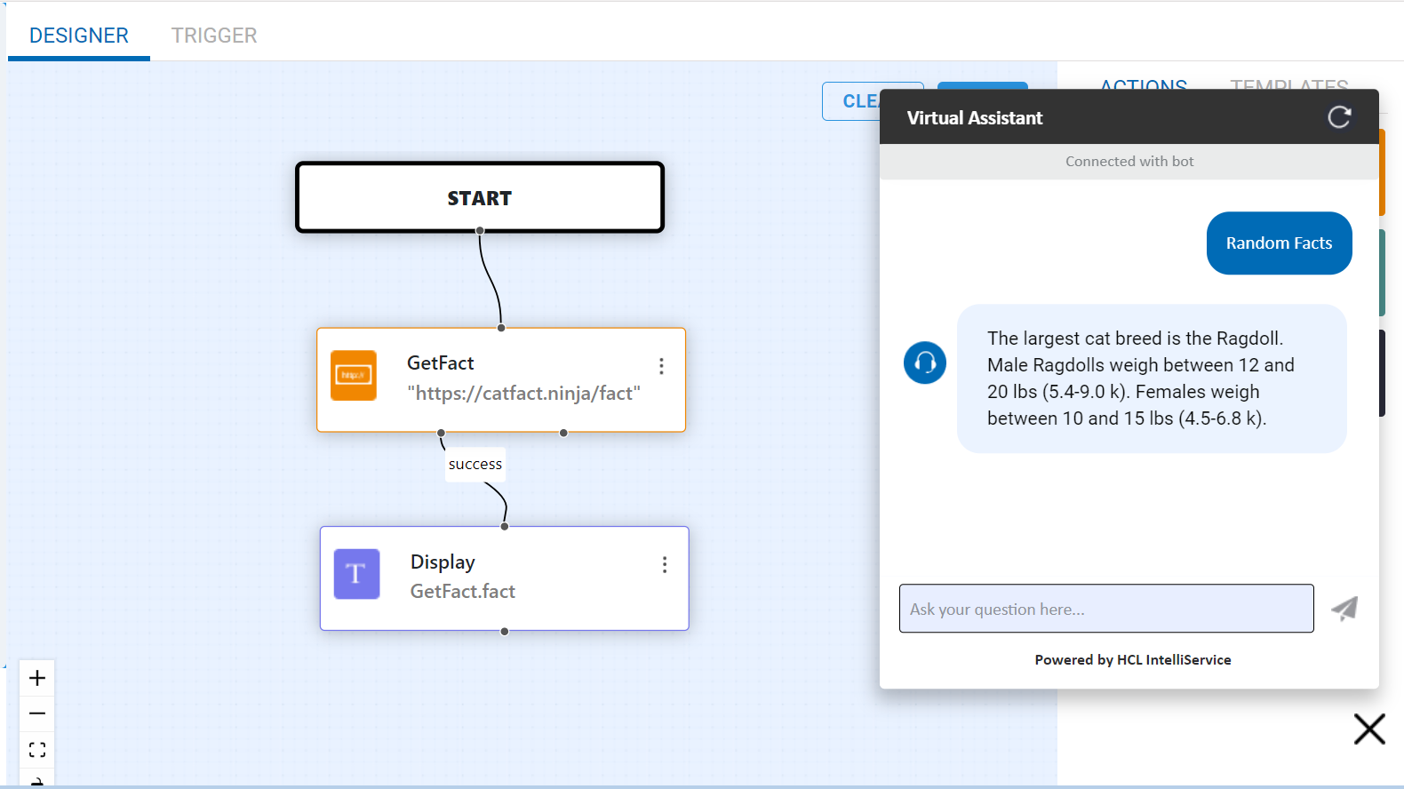 A sample flow demonstrating the HTTP node and its response in Chat. Here, we have used Open API to get random CAT facts, where in the text node, GetFact is the HTTP node and .fact API parameter containing the facts.