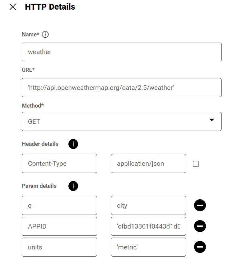Use this HTTP node to add an API service to make REST requests to third-party web services. You can use this node when you have the parameters needed for the API request using an entity or other nodes to capture the user input. While configuring the parameters, in the value field, make sure to use single or double quotes to set the parameter value and avoid quotes to directly set variable (can be node name). By default, HTTP node stores the response of the API call, and to process the response, directly call the node name in the subsequent nodes. Use the standard formats to define the text to be displayed in the chat conversation.