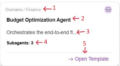 This intuitive combination of keyword search and tag-based filtering ensures that users can quickly discover relevant agent templates suited to their needs, whether by functional domain, industry, or operational category.