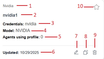 Each Profile is represented by a tile (card), providing a quick overview and action controls. A typical profile card includes the following fields: