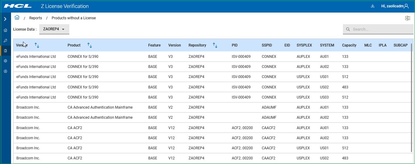 Report showing products identified that do not have a license.