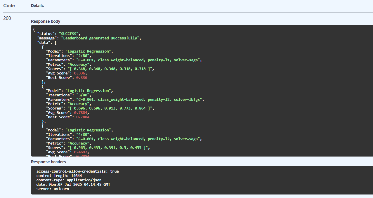 Provides a leaderboard comparing multiple trained models or configurations for a given use case. This helps in selecting the best-performing model.