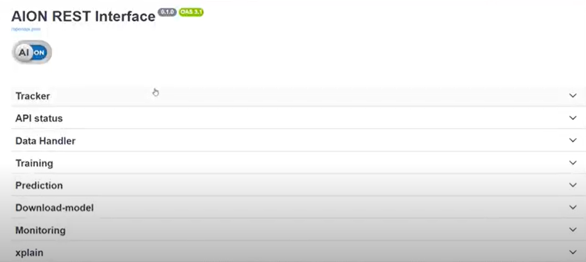 REST API RESTful services for managing datasets, models, and endpoints, and making predictions with saved models, downloading, monitoring. URL: http://<host>: 8000/aionbe/docs