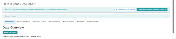 Note: While performing EDA, the user has an "Add to Report" button that they can click. Once all selections are made, the complete report can be downloaded using the "Download EDA Report" button.