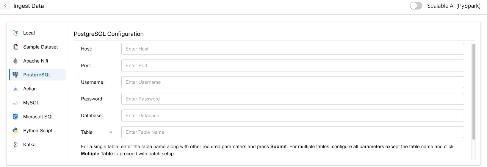 1. Select different SQL databases and data warehouses for data ingestion, such as PostgreSQL, Actian, MySQL and MicrosoftSQL.