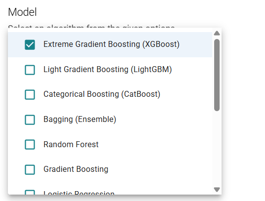 Model Based on the chosen Problem Type, a list of ML algorithms (models) will be shown. You can select a model from the given list.