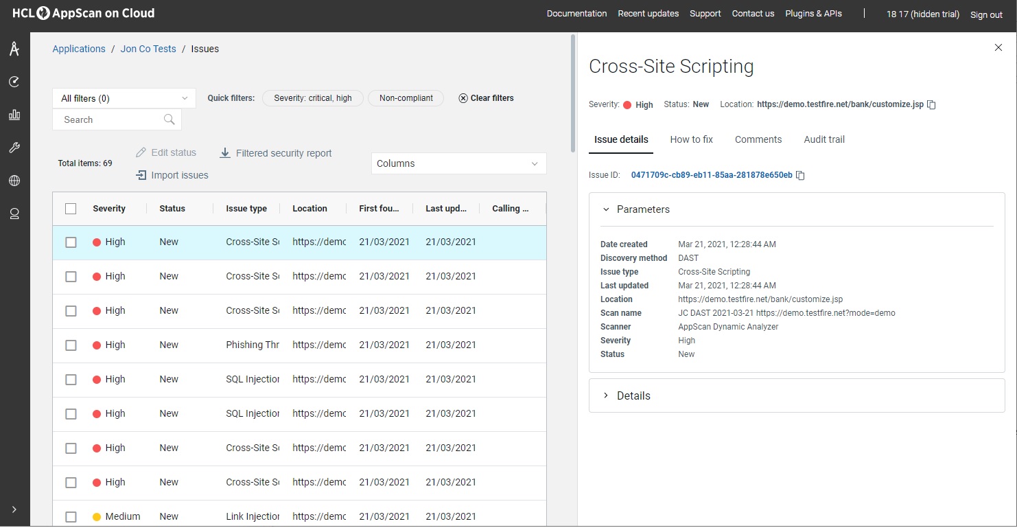 | Issue details | Shows the basic issue parameters, issue type, test requests and responses, and where possible highlights the part of the code where the vulnerability is contained or shown. |