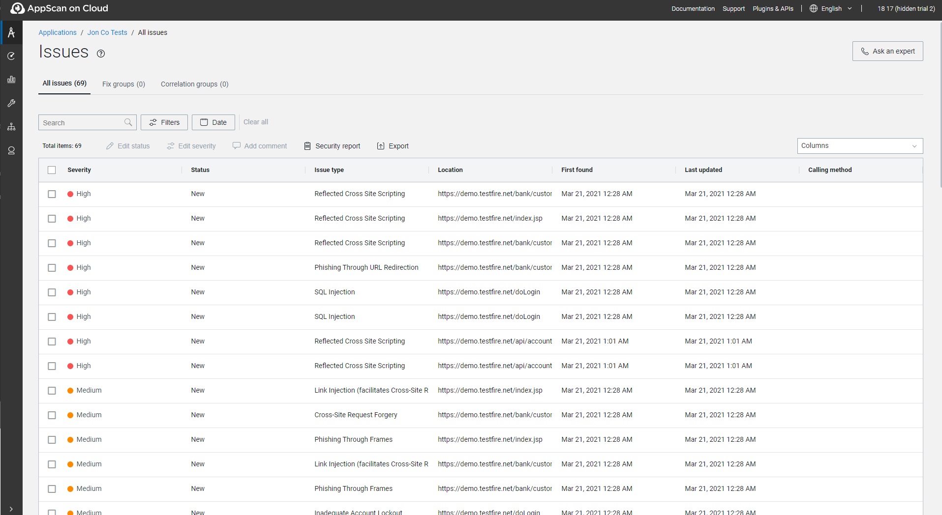 The Issues page for an application shows all issues found. You can apply a variety of filters to see the issues you need, and click on any issue to open the detailed issue information pane.