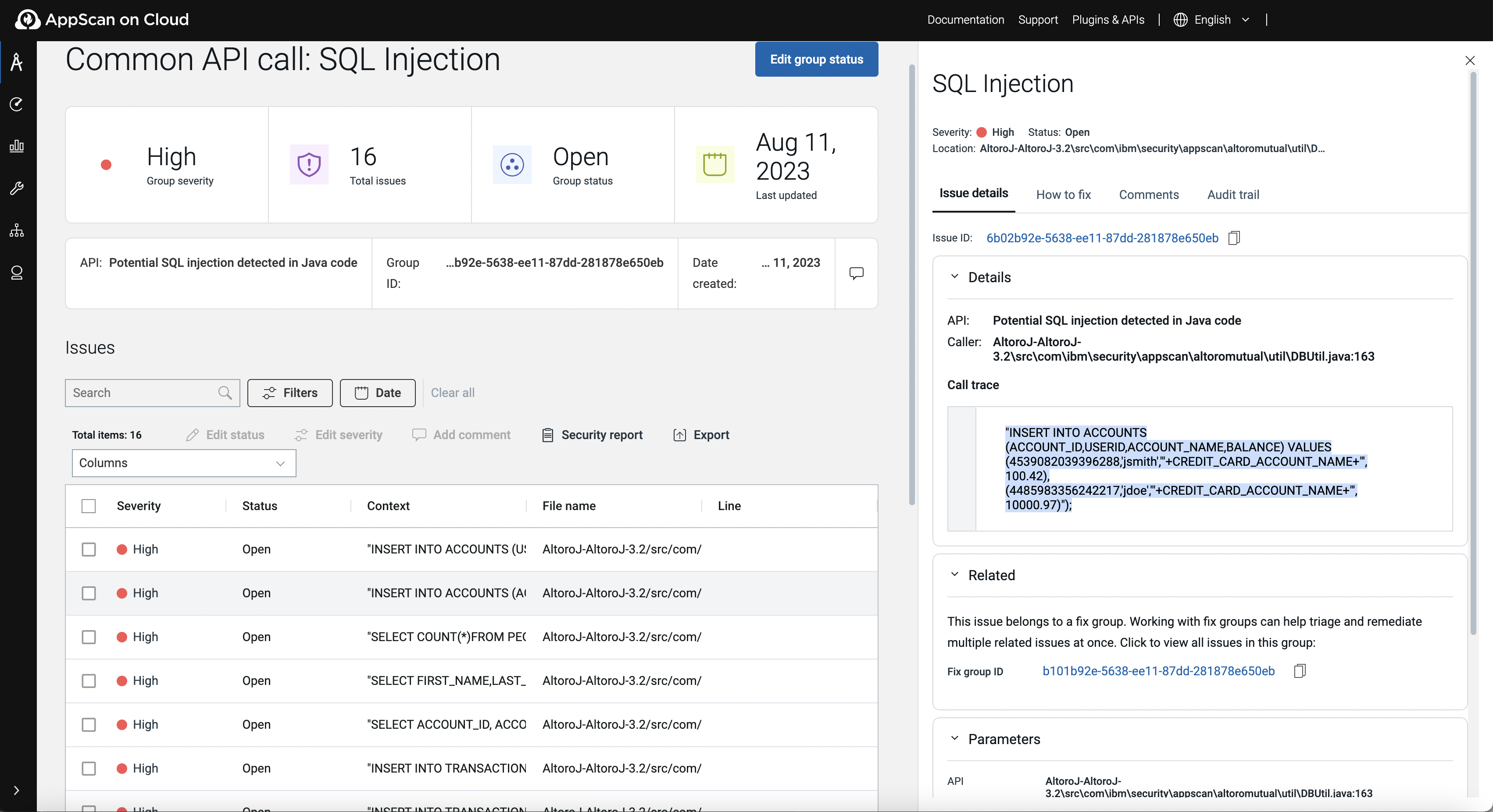 In this example there are 16 total issues within the fix group that use a common API. They each need to be resolved separately, however the fix is similar or possibility identical in these instances.