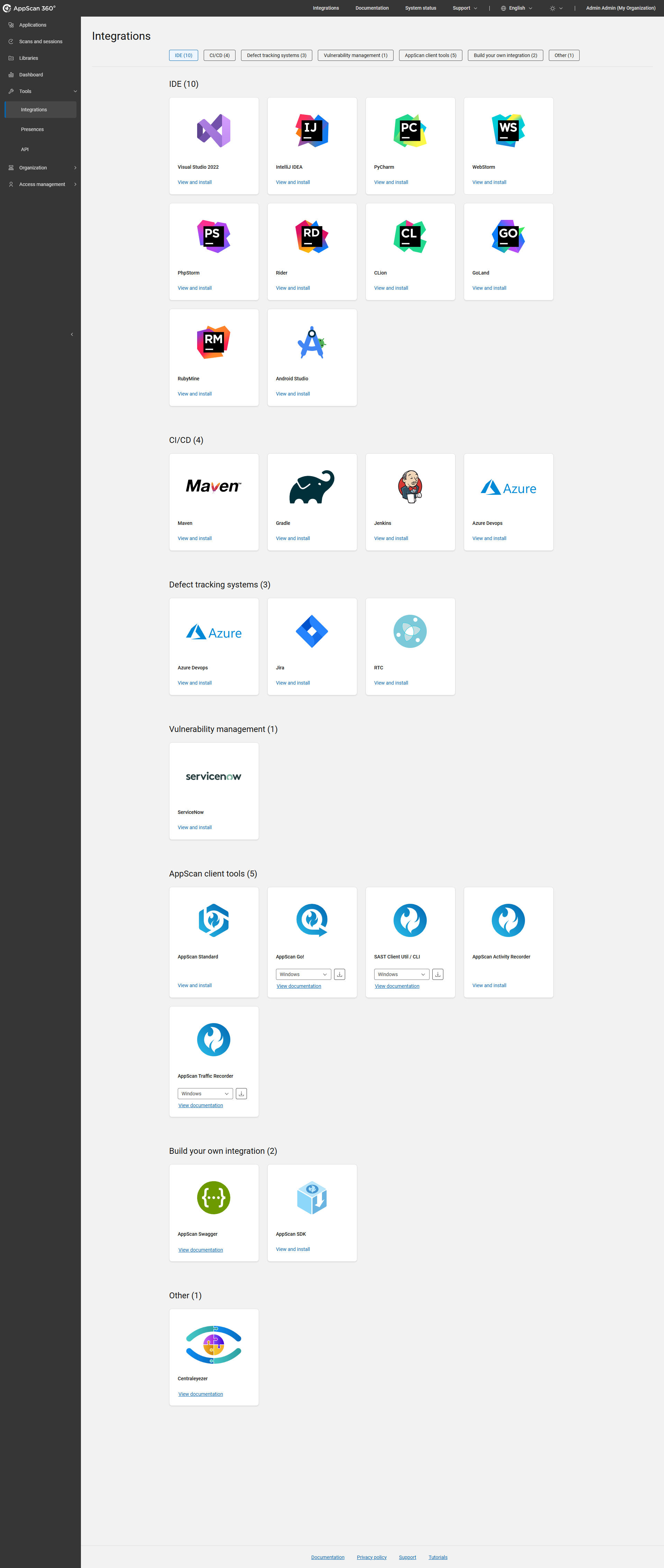 | HCL AppScan JetBrains Plugin, including IntelliJ Idea, PyCharm, WebStorm, PhpStorm, Rider, CLion, GoLand, RubyMine | 2.9 and newer | 1.3.0 and newer | Pull scans and fix groups data from AppScan 360° within the IDE. |