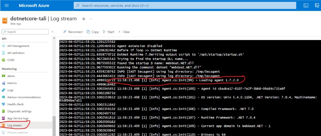 - In Azure: Check Log stream for IAST agent startup and connection messages.