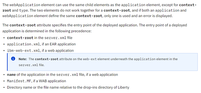 - If context root is defined in server.xml for the application, then the value of the contextRoot attribute of the webApplication element is the application name.