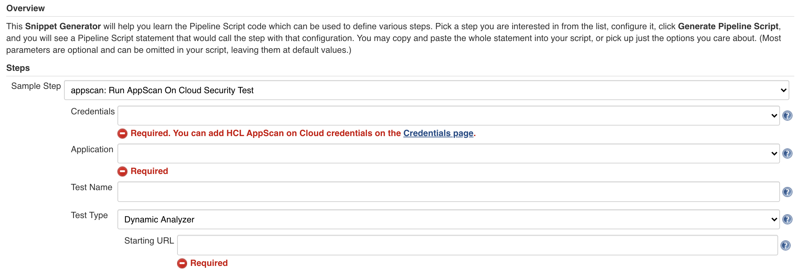 The syntax generator displays the script in the text box below the button. Copy this syntax to your Jenkinsfile to include a security test step in your existing script.