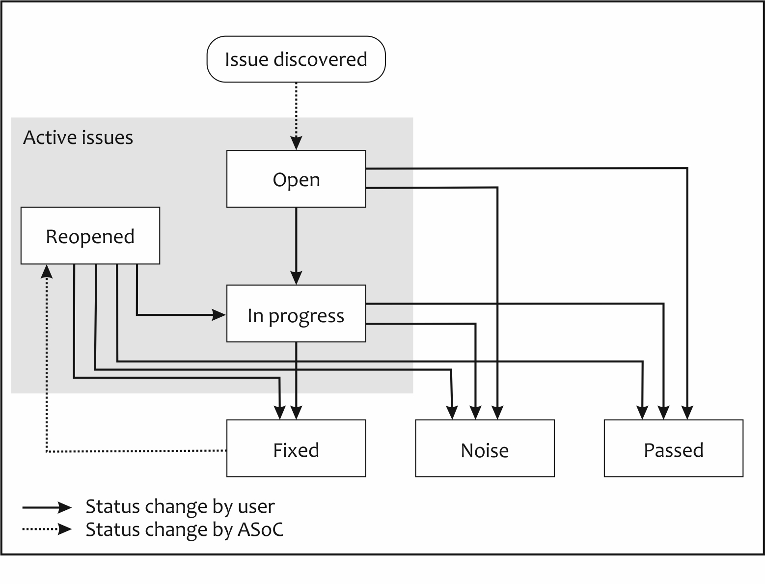 The way you utilize issue status may depend on your organization and processes. Issues can be changed to Noise or Passed at any stage in triage. Once an issue is assigned one of these statuses it will not be reopened if found in a future scan, and will not be considered an Active issue (Open, In Progress, Reopened) when calculating Risk Rating.