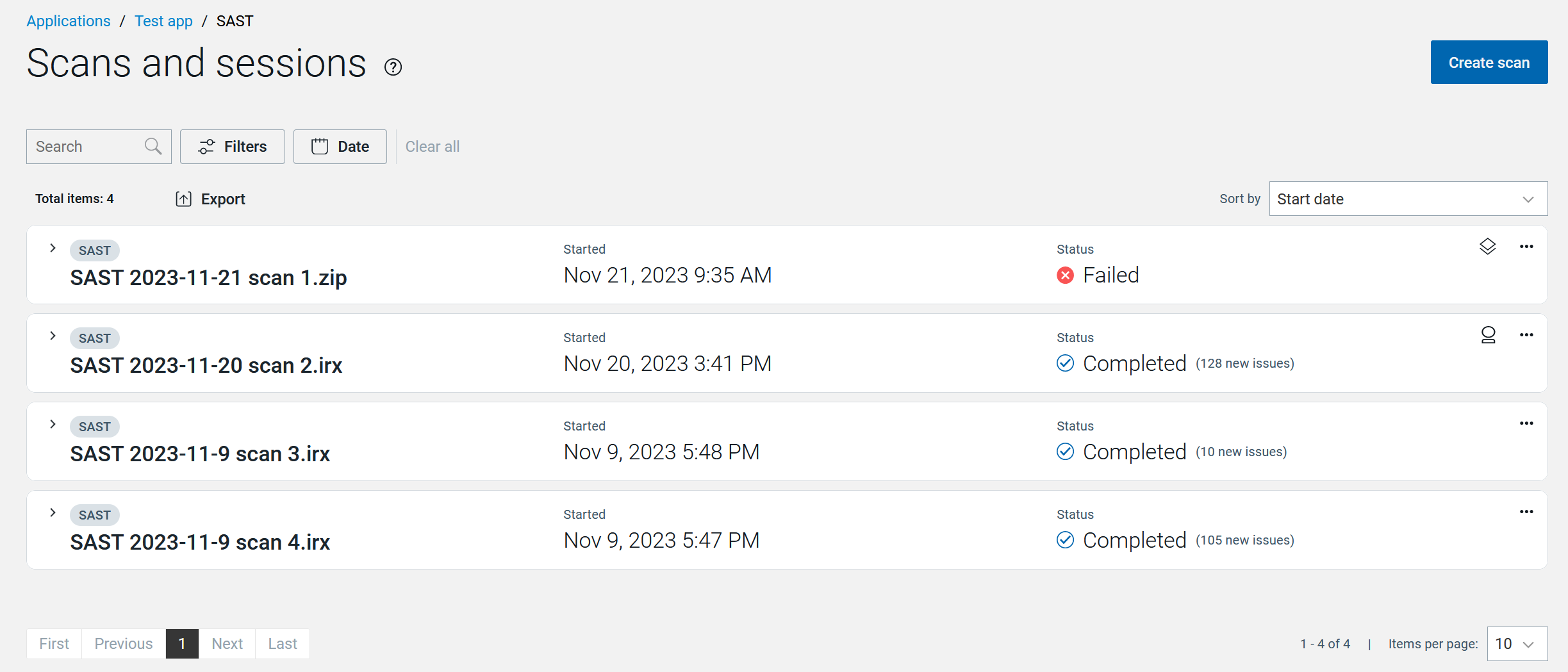 | Create scan | (Only when list is for all scans in an application) Opens the Create a scan wizard. See Dynamic Analysis (DAST), Interactive Monitoring (IAST), Software Composition Analysis (SCA), or Static analysis (SAST). |