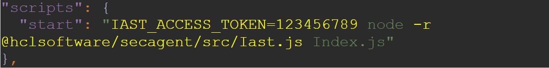 package.jsoncomme commande d'exécution. Modifiez le script de démarrage pour définir la clé d'agent de l'étape 3 ci-dessus comme variable d'environnement et pour exécuter l'agent IAST de l'étape 4 comme package requis.Par exemple, si la commande initiale était :