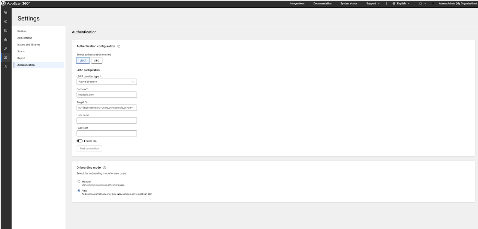 Authentifiez les utilisateurs pour AppScan 360° à l'aide de l'authentification unique (SSO) ou LDAP.