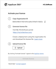 - Créez un déploiement dans My HCLSoftware (MHS), spécifiez les autorisations et téléchargez le fichier de licence. Pour plus d'informations, voir Gestion des déploiements AppScan 360°dans My HCLSoftware.