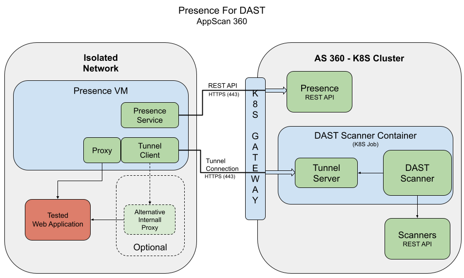 Le tunnel d'examen de site privé repose sur un mécanisme central contrôlé par AppScan 360° appelé AppScan Presence : un canal de communication qui reçoit des tâches à réaliser depuis le service central, et qui déclenche la réalisation de ces tâches par des gestionnaires. Le service Presence est un service d'interrogation qui interroge constamment le service AppScan 360° à propos de tâches à l'aide d'une communication HTTP sécurisée.