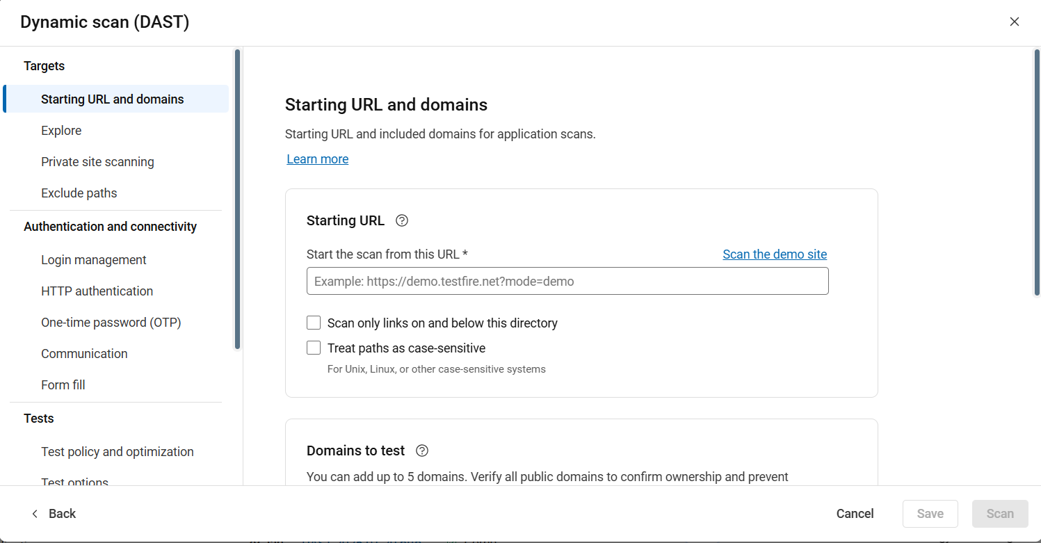 - Pour les applications Web, saisissez l'URL à partir de laquelle l'examen doit commencer. Si vous saisissez l'URL au format IPv6, placez-la entre crochets []. Par exemple, [2001:0000:130F:0000:0000:09C0:876A:130B].