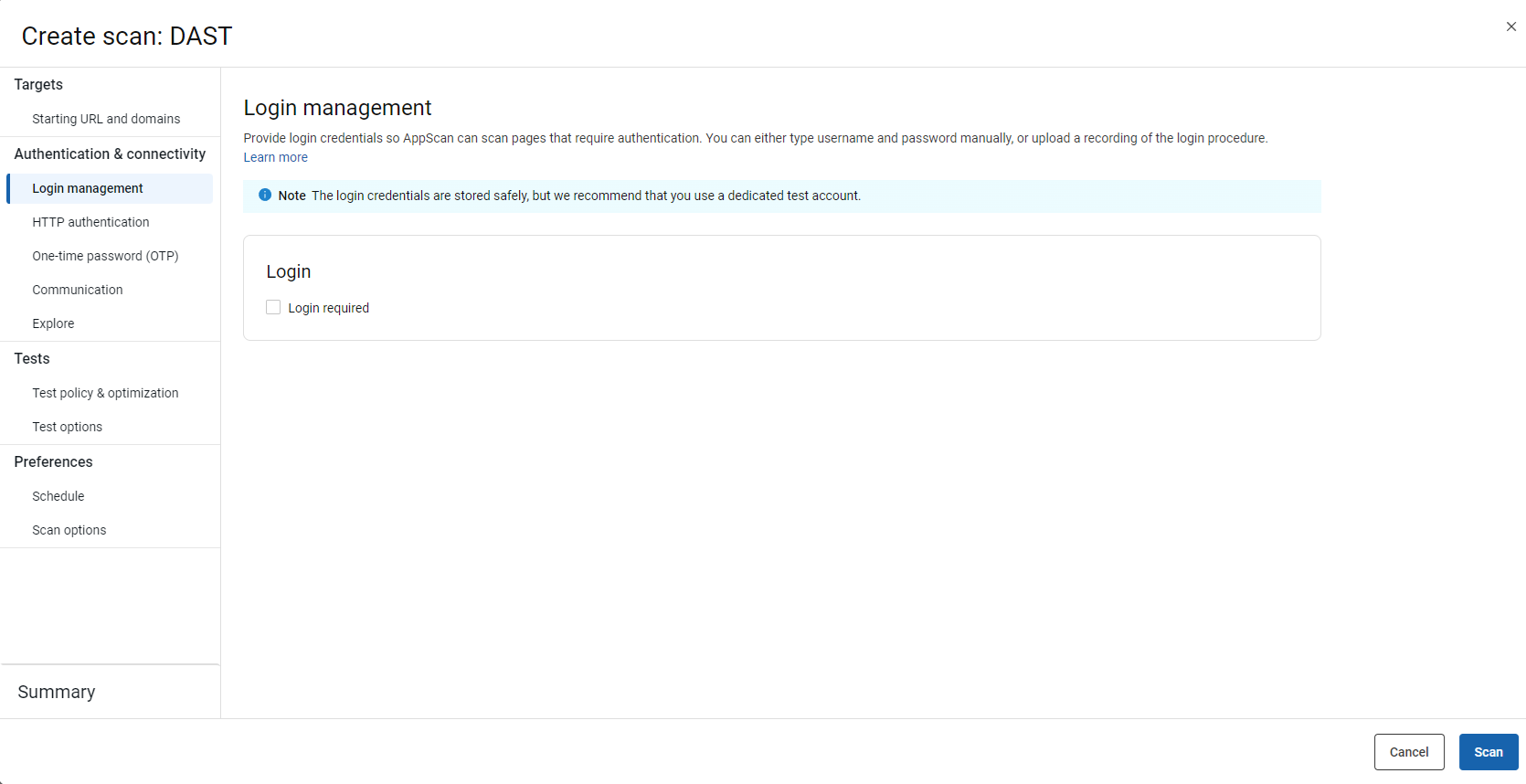 - Cliquez sur ce lien pour renseigner l'URL du site de démonstration AppScan. Vous pouvez ainsi exécuter un examen sans vérification de domaine. Dans l'onglet Connexion, saisissez le Nom d'utilisateur