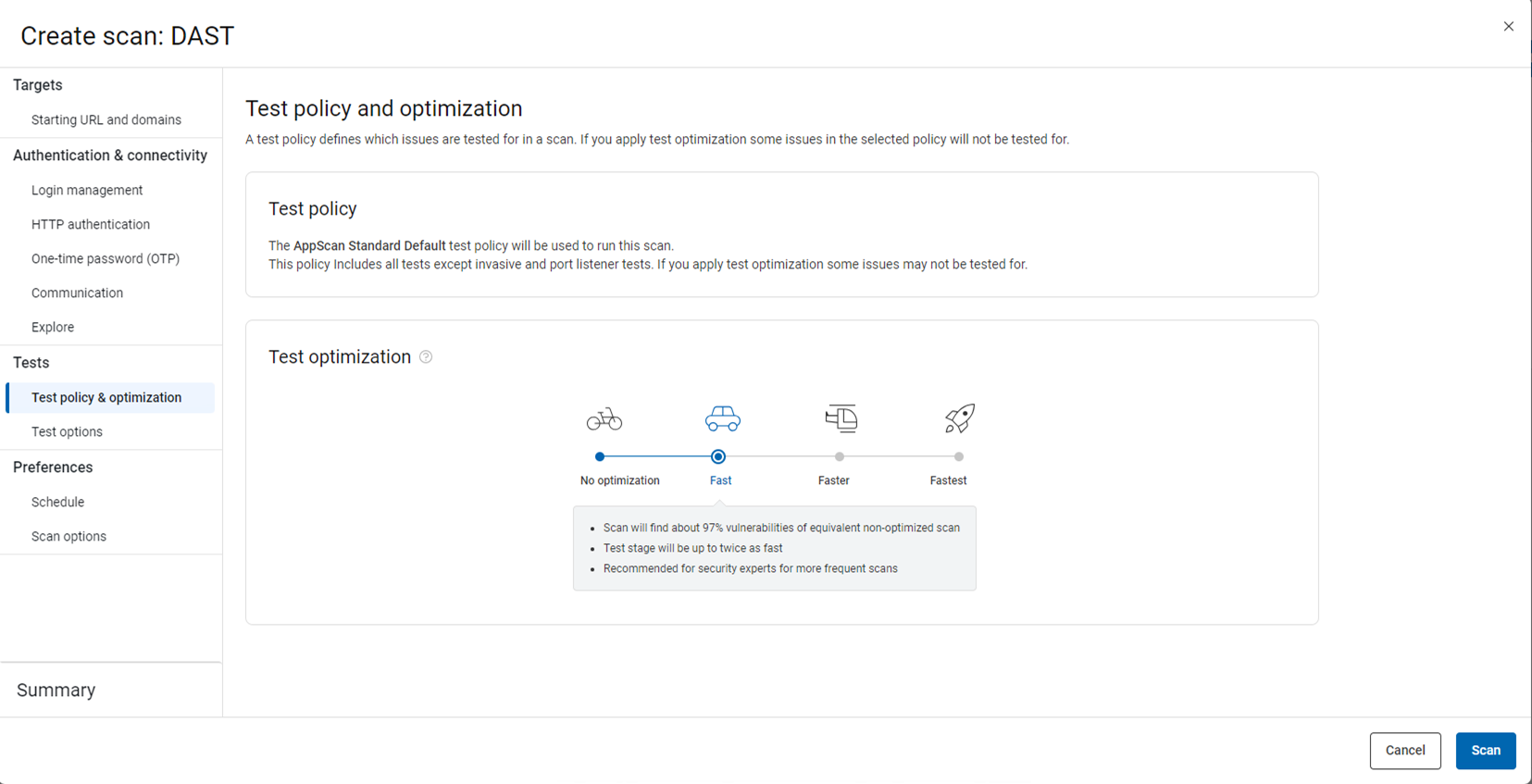 Sélectionnez le niveau de compromis entre la vitesse de l'examen et la couverture des problèmes pour vos besoins. Le curseur propose quatre niveaux. La valeur par défaut est Rapide. Pour plus d'informations, reportez-vous à Optimisation du test.
