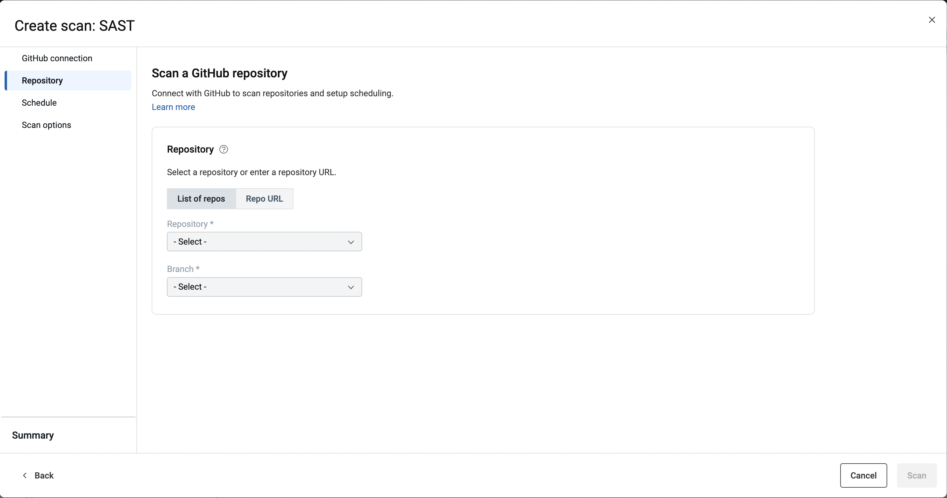 - Dans l'onglet Référentiel, spécifiez le référentiel et la branche à examiner à partir d'une liste de référentiels disponibles.Lorsque vous choisissez des référentiels dans la liste des référentiels disponibles, choisissez d'abord le parent, puis la branche.