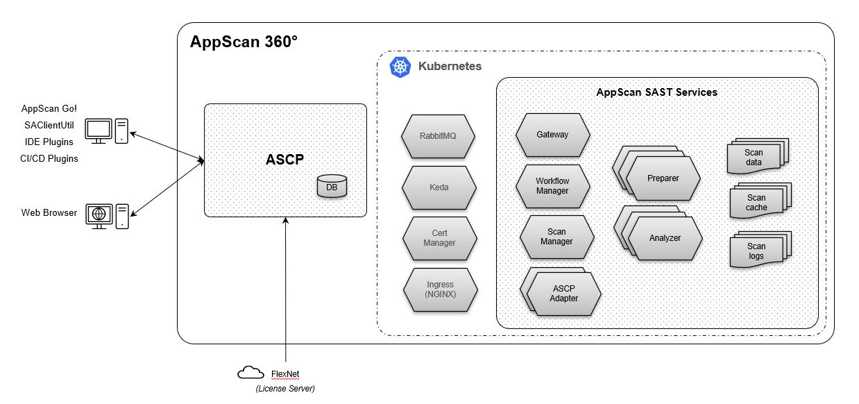 管理者の観点からの、AppScan 360° 静的分析 ランタイム環境の構成は以下のとおりです。