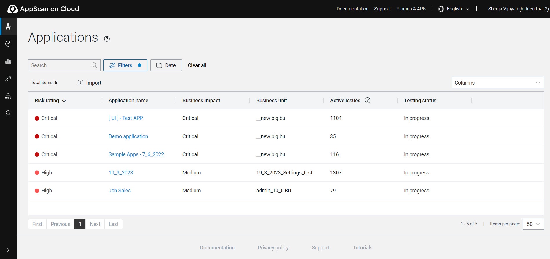 AppScan 360° アプリケーションは、同じプロジェクトに関連するスキャンのコレクションです。Web サイト、デスクトップ・アプリケーション、モバイル・アプリ、Web サービス、アプリケーションの任意のコンポーネントなどが対象になる可能性があります。「アプリケーション」では、リスクを評価したり、傾向を把握したり、プロジェクトが業界や組織のポリシーに準拠していることを確認したりできます。
