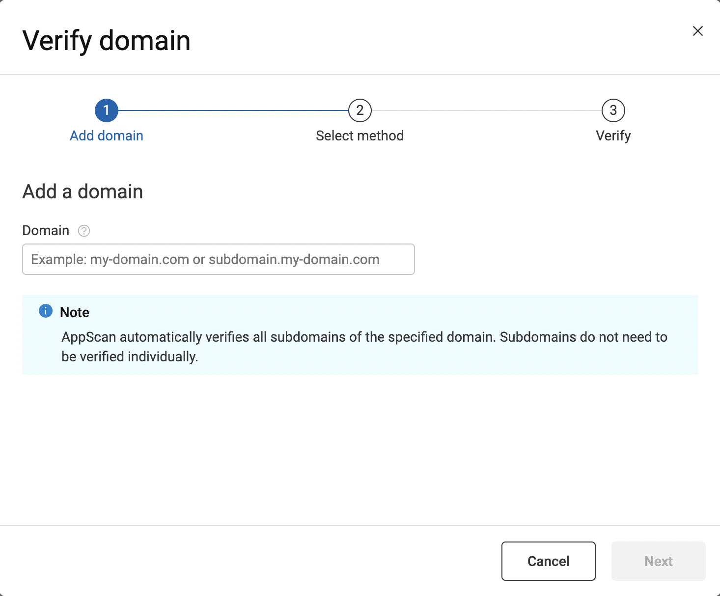 インターネット上でドメインをスキャンするには、ドメインをスキャンする許可があることを ASoC で検証する必要があります。インターネット上で使用できないドメイン (プライベート・サイト) では、検証は必要ありません。