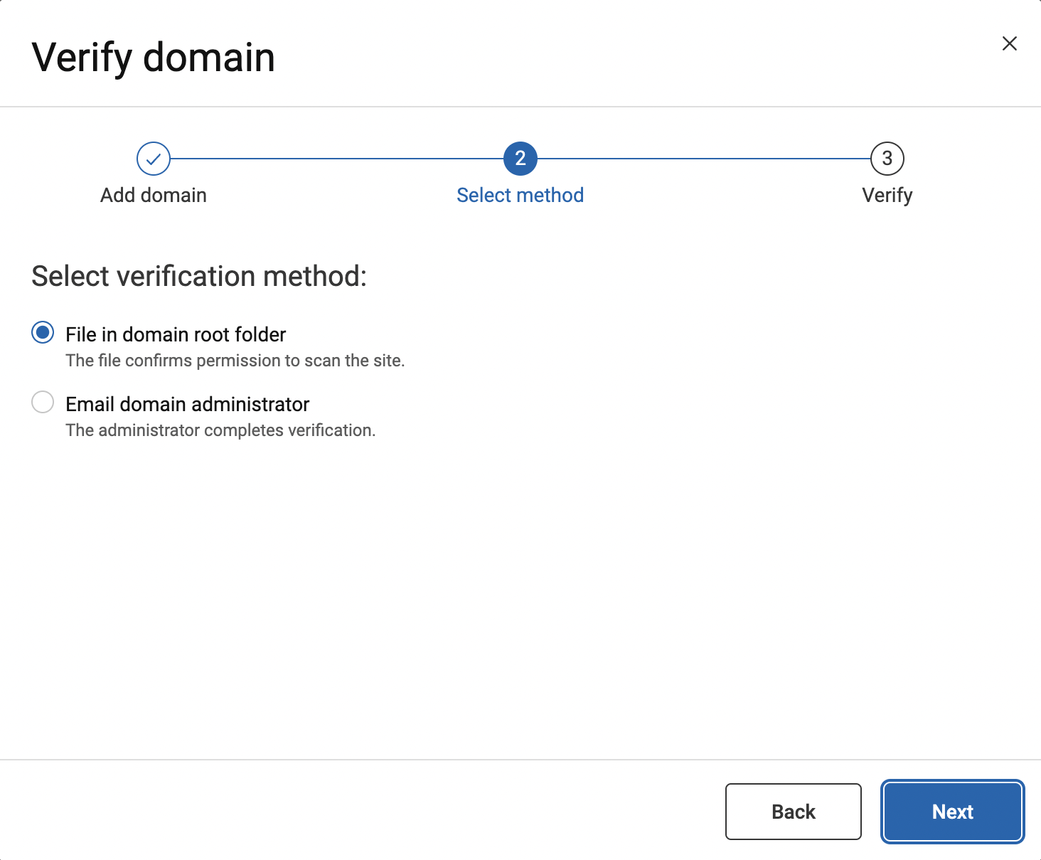 サイトがドメインのリストに追加され、状況は「保留中」になります。スキャンを初めて実行するとき、ASoC は追加したファイルを検証し、状況を「検証済み」に変更します。30 日経過しても検証されなかったドメインは、リストから削除されます。
